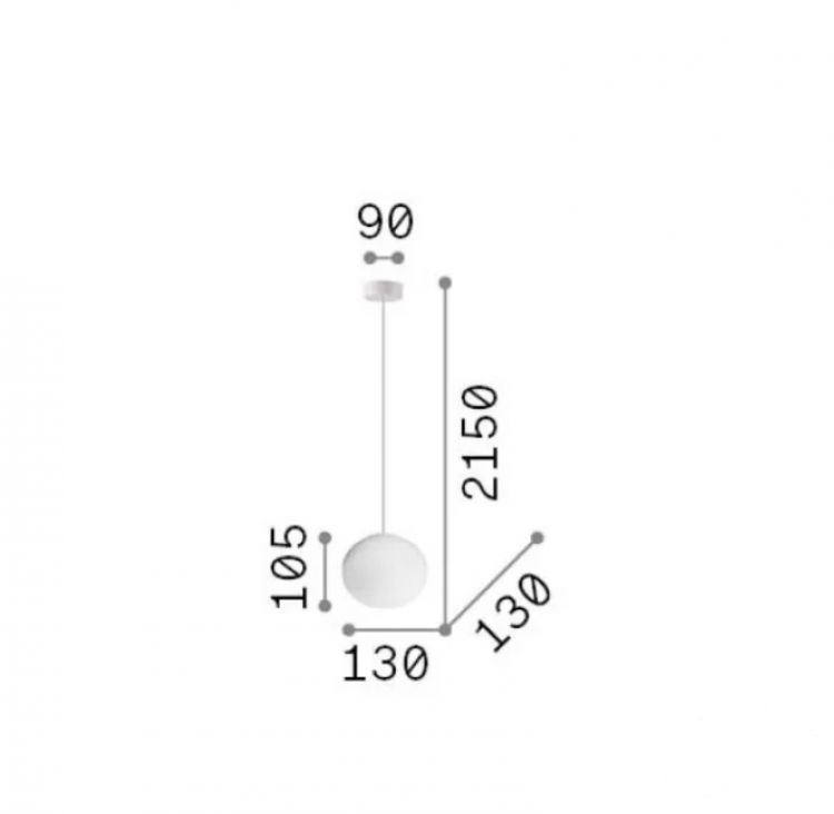 Metalowa rama i rozeta sufitowa wykończone białą powłoką proszkową, z bezśrubowym zamknięciem magnetycznym. Przezroczysty kabel PVC. Biały, trawiony kwasem klosz z dmuchanego szkła.