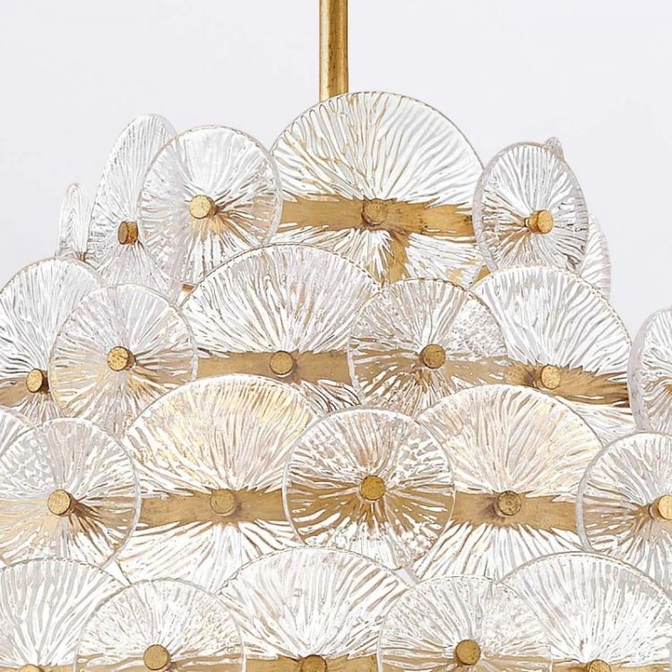 Żyrandol Rene z 16 źródłami światła w wykończeniu przecierany mosiądz to dekoracyjna i pełna blasku forma, która tworzy spektakularny efekt w przestrzeniach z wysokim sufitem. Konstrukcja opiera się na kilku warstwach tłoczonych, szklanych dysków, które odbijają światło niczym szlifowane kryształy. Elegancki stelaż w ciepłym, złotym odcieniu dopełnia całości, łącząc wpływy stylu glamour i klasycznego modernizmu.