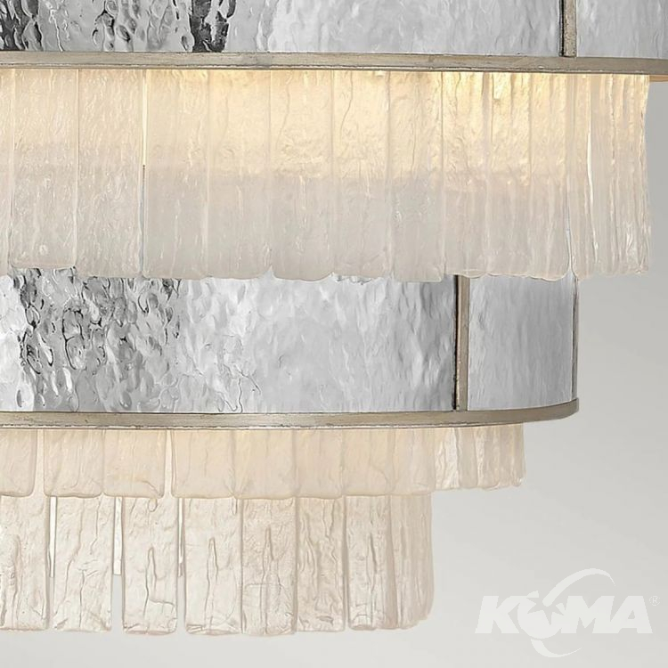 Lampa wisząca Reverie z 12 źródłami światła to najbardziej rozbudowany model z tej kolekcji, idealny do przestronnych i wysokich wnętrz. Jej trójwarstwowa konstrukcja łączy dekoracyjne pasy o szampańskiej, metalicznej strukturze z opadającymi elementami przypominającymi mleczne kryształy. Zróżnicowana faktura materiałów oraz subtelna gra światła tworzą wyjątkowy efekt wizualny, który podkreśli elegancję salonu, jadalni lub reprezentacyjnego holu. Lampa doskonale odnajdzie się w aranżacjach w stylu glamour, art déco lub nowoczesnej klasyki – wszędzie tam, gdzie liczy się luksusowy detal, symetria i blask wysokiej jakości wykończenia.