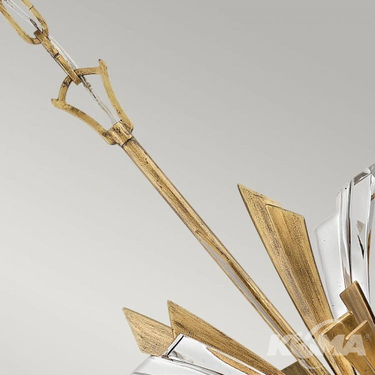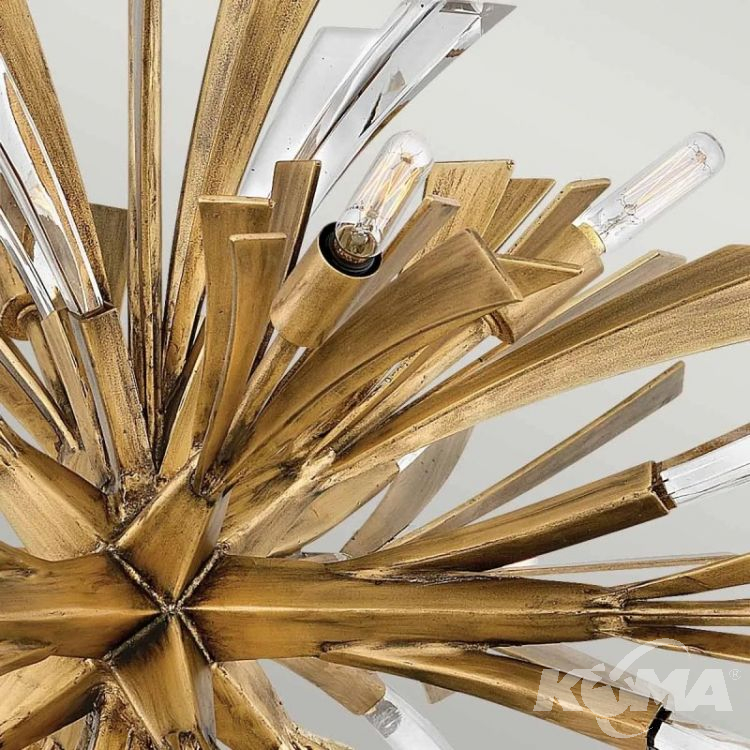 Lampa wisząca Vida z 13 źródłami światła to spektakularna oprawa o kulistej, eksplodującej formie. Dziesiątki złotych, rzeźbionych ramion mieszają się z elementami z grubego szkła, tworząc dynamiczną i elegancką kompozycję. Model ten stanie się centralnym punktem salonu, holu lub ekskluzywnej przestrzeni komercyjnej, takiej jak lobby czy showroom. To propozycja dla wnętrz, które nie boją się odważnych, designerskich rozwiązań.