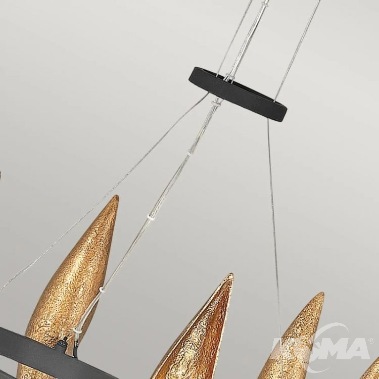 Żyrandol Willow z 6 źródłami światła to zachwycająca kompozycja o harmonijnej, symetrycznej strukturze. Złote liście otaczające każde źródło światła działają jak naturalne reflektory, podbijając ciepły blask żarówek i tworząc niezwykle dekoracyjną grę światła i cienia. Czarna rama dodaje całej konstrukcji współczesnego wyrazu. To doskonały wybór do jadalni, salonów lub ekskluzywnych przestrzeni komercyjnych, w których liczy się zarówno funkcja oświetleniowa, jak i artystyczna forma.