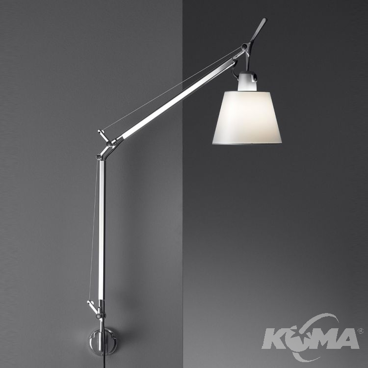 Wspornikowe ramiona z polerowanego aluminium; Dyfuzor w pergaminie na plastikowej ramce; uchwyt ścienny z polerowanego aluminium. System równoważenia sprężyny. Kod odnosi się do korpusu oprawy jedynie.