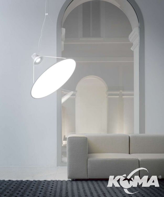 Wyzwaniem projektowym Amisol jest stworzenie lampy wiszącej, która zajmuje dużą przestrzeń fizycznie o objętości zredukowanej do minimum zorientowanej w przestrzeni. Przezroczysta biała folia lub metalowa membrana lustra jest rozciągnięta w okrągłym profilu aluminiowym. Podobnie jak żagiel słoneczny, niezwykle potężne źródło światła rzutuje wiązkę światła na duży, bardzo lekki dysk, zarówno rozprzestrzeniający się, jak i odbijający światło. Cienkie pręty łączą dwa główne elementy. Zmieniając długość i punkty połączenia dwóch przewodów nośnych uzyskujemy obrót dysku z możliwoscią  ustawienia pod dowolnym kątem.