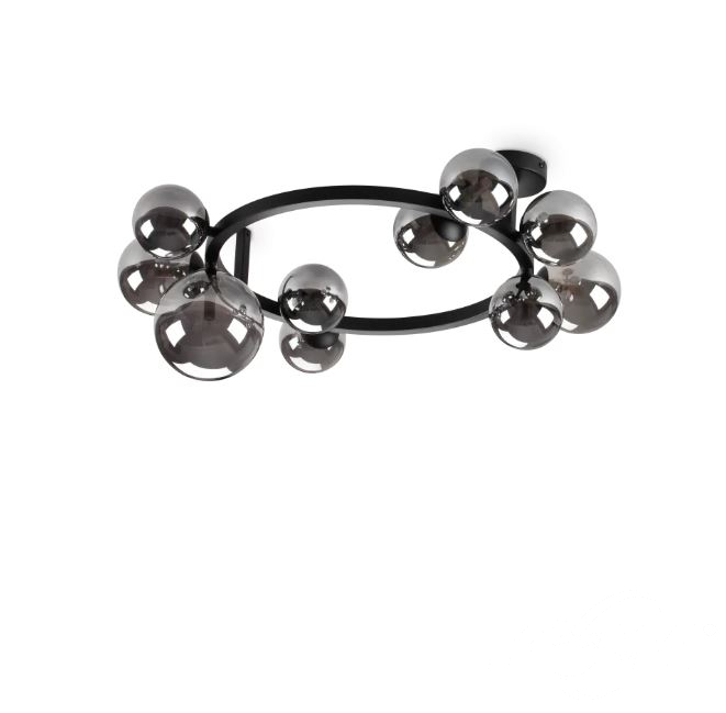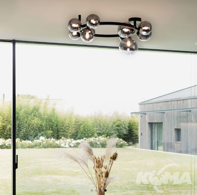 Metalowa rama o okrągłym, liniowym przekroju lub kwadratowym, okrągłym przekroju. Klosze z dmuchanego szkła. Wykończenia: matowa czerń z bursztynowymi lub dymnymi szkłami Pyrex lub satynowany mosiądz z trawionymi białymi szkłami.