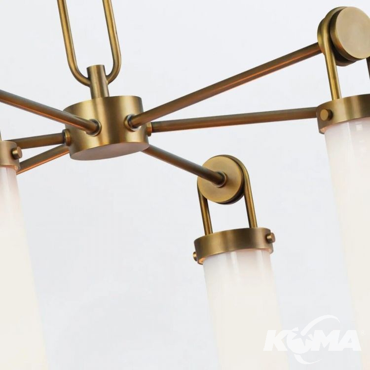 Żyrandol z 6 źródłami światła z kolekcji Wynwood w wykończeniu vintage mosiądz to wyrazista forma o mocnym charakterze. Industrialne detale w połączeniu z ciepłym odcieniem metalu i mlecznobiałymi kloszami tworzą kompozycję, która sprawdzi się zarówno w salonie, jak i nad dużym stołem jadalnianym. Wykończenie: vintage mosiądz